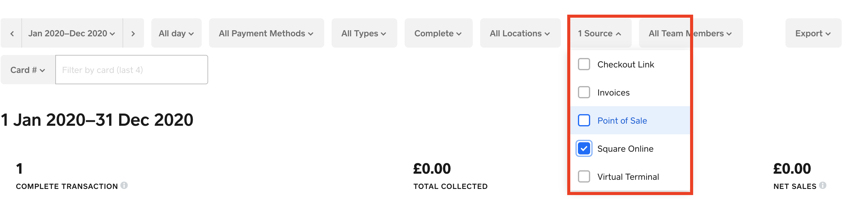2. From your Dashboard > Transactions > Click All Source > Select Square Online