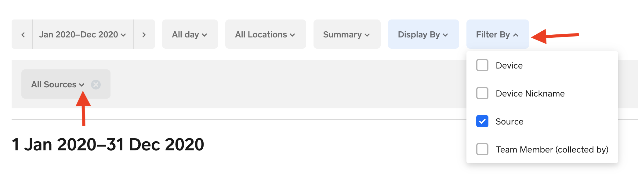 1. From your Dashboard > Reports > Click Filter By > Select Source > Click the little arrow on Source filter > Select Square Online
