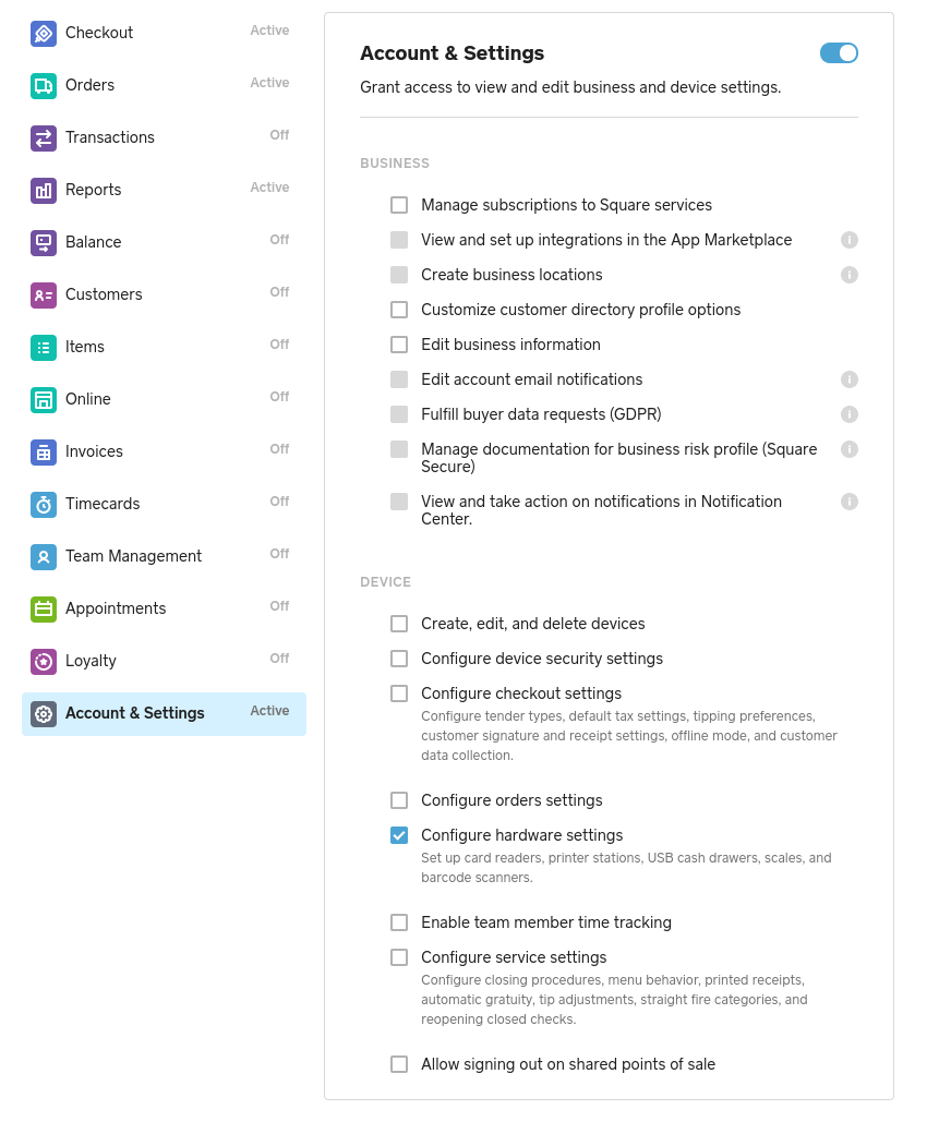 First, go to your permission sets on Dashboard and click on the permission set assigned to the staff member. Then go to Account & Settings and make sure Configure hardware settings is ticked, then press Continue in the top right.