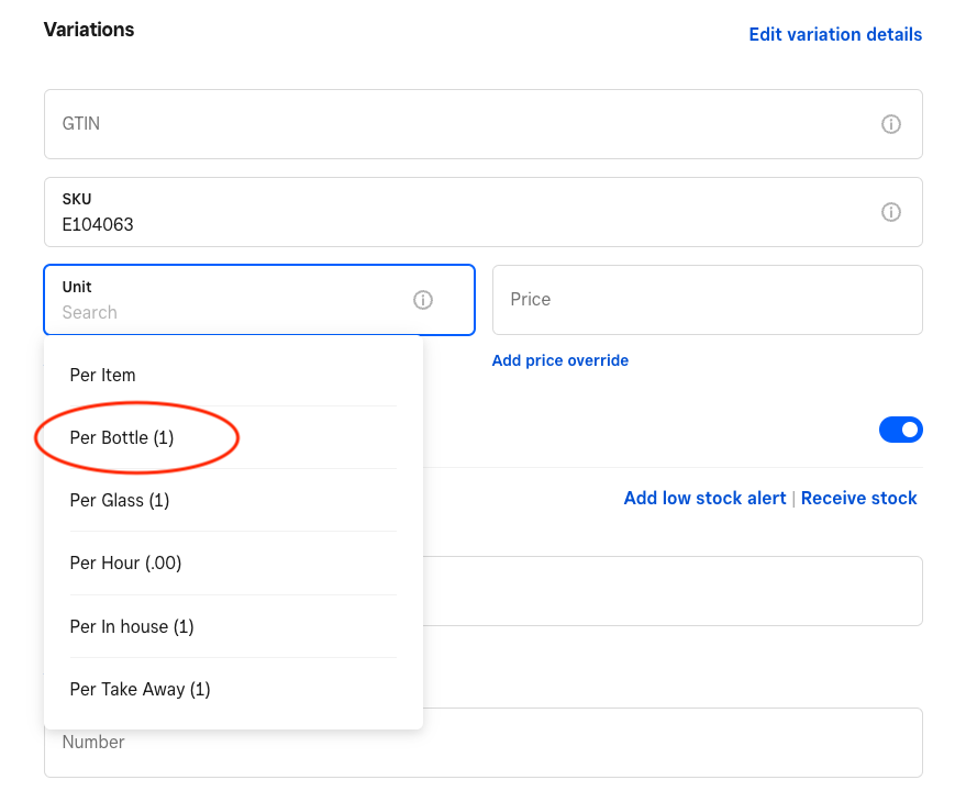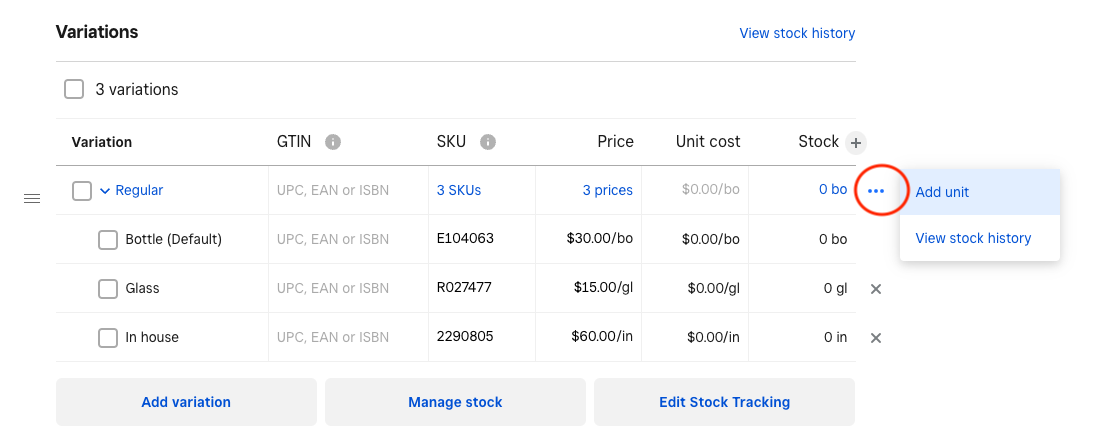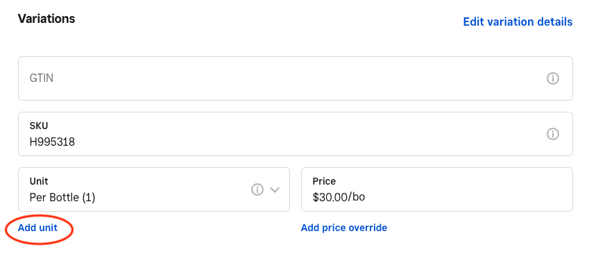 3. In the Variations section, select Add Unit, and select one of the Units you've already created. Next, enter the price for this item.