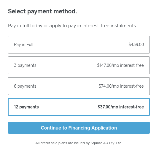 To access installments you'll need to make sure you're signed in to your Square account (as opposed to guest checkout) and get past the point of entering a delivery address (but before entering payment info). You'll then see these options: