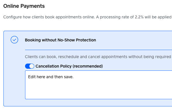 I've noticed that in my online booking setup the 'required cancellation policy' field is uneditable and says "We ask that you please reschedule or cancel at least 12 hours before the beginning of your appointment or you may be charged a cancellation fee."