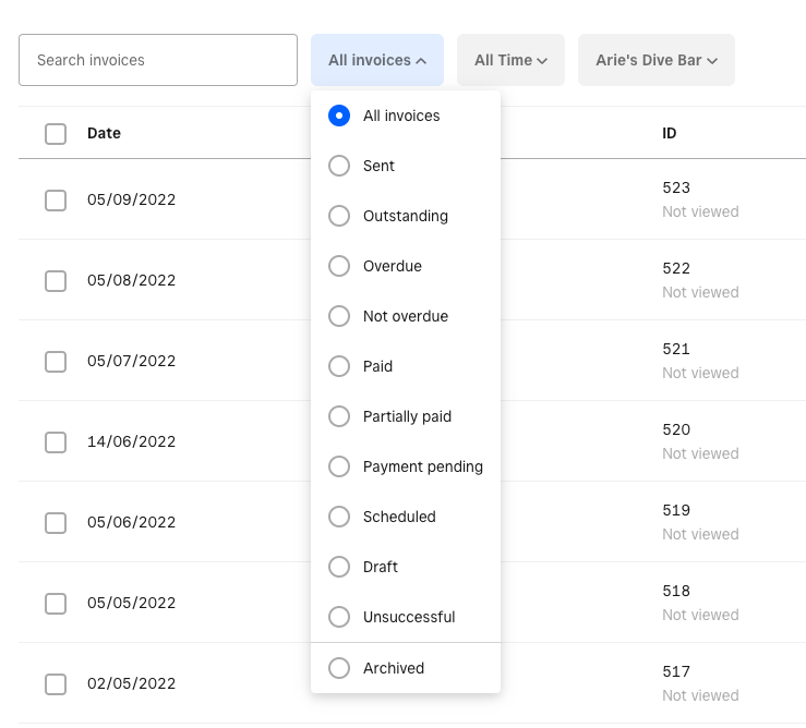 Right now, Square Invoices can't be filtered by fulfilment date, but you can use the following available filters: