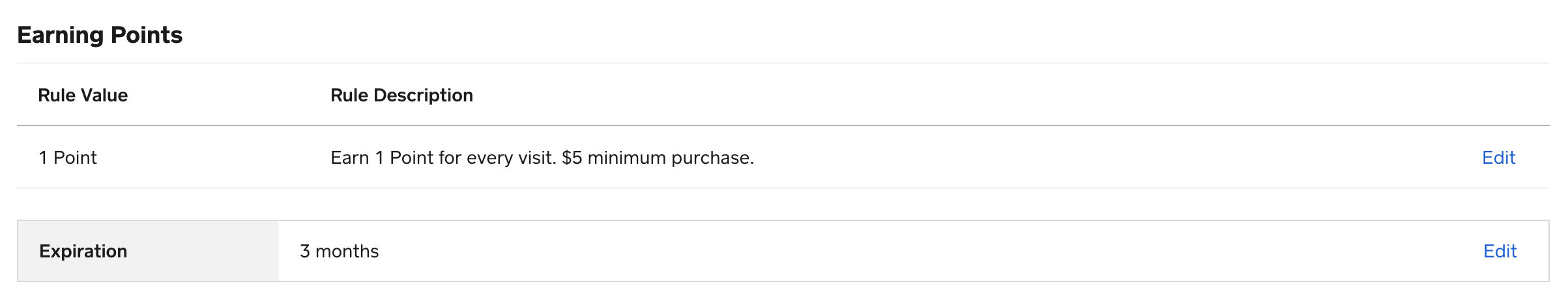 • Per Amount Spent: Reward points based on the total amount spent before tax and tip. For example, 1 point per every $5 spent on a purchase.
