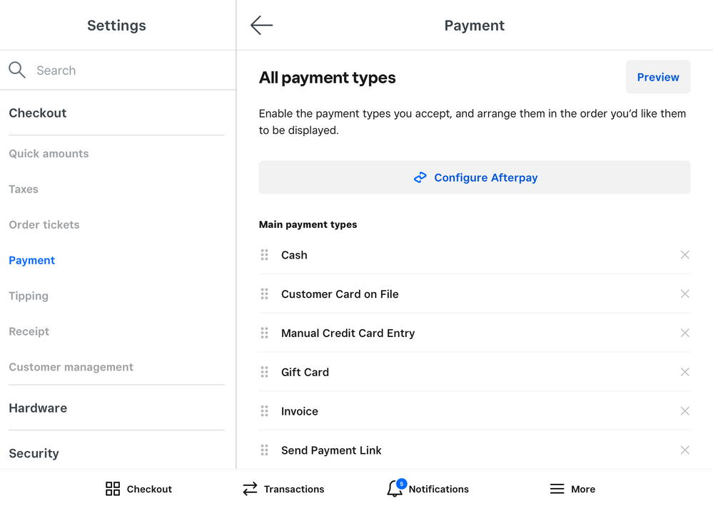 To see if you are eligible for Afterpay and Square, log into your Square Dashboard and review your Payment Methods.