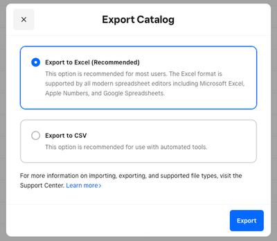 From within the Square Item Library, select the “Export Library” option from the “Actions” dropdown. You may “Export to Excel” (recommended) which will create a download suitable for most spreadsheets like Excel, Google Sheets, etc.