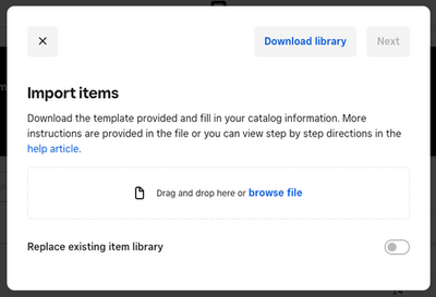 Select your updated spreadsheet from the modal. If you wish to replace your existing item library with the upload, toggle on “Replace existing item library” (use caution if you choose this method!)