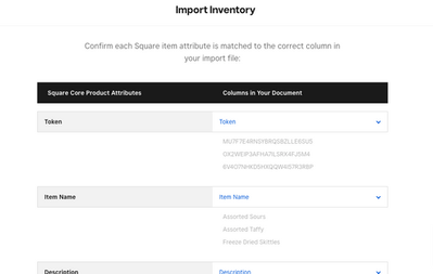 Confirm that that each Square item attribute is matched to the correct column in your import file:
