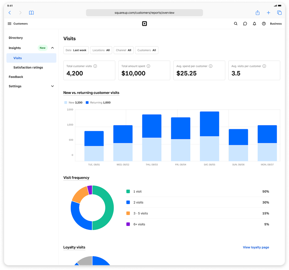 The topline breakdown includes total customer visits, total amount spent, average spend per customer, and average visit per customer. New filters include date, location, channel, and customer group filters. This report will save you time as you look to better understand your business and get to know your new vs. returning customers.