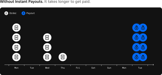 Without Instant Payouts it takes longer to get paid. When orders are received through DoorDash and Uber Eats, net earnings are aggregated and then deposited all at once according to your payout cycle — sometimes up to 11 days later.