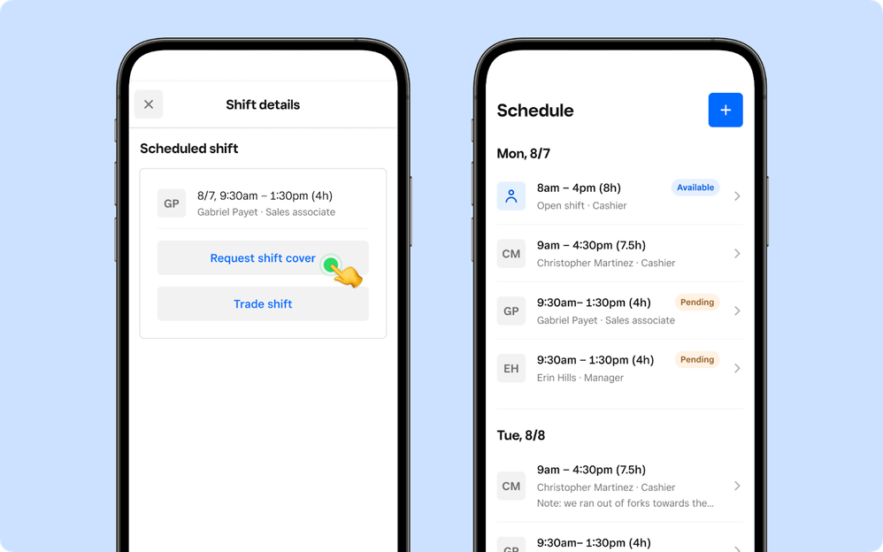 In the Square Team App, a team member can initiate a cover request for a shift they can no longer work. Eligible team members receive a request notification and can accept the shift, which is reviewed and approved by a manager on Dashboard. This new feature is available to 100% of sellers in all markets.