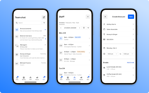 Owners, operators, and managers are encouraged to download the Dashboard app, while team members can continue to use the Square Team app to interact with Square platform. Individual team access to these apps are managed by the team member’s permissions setup on Dashboard web. Depending on your subscriptions, sellers can expect to see the Team Chats and Staff tabs once the Dashboard app is downloaded and be able to manage the following Staff tasks on the app: