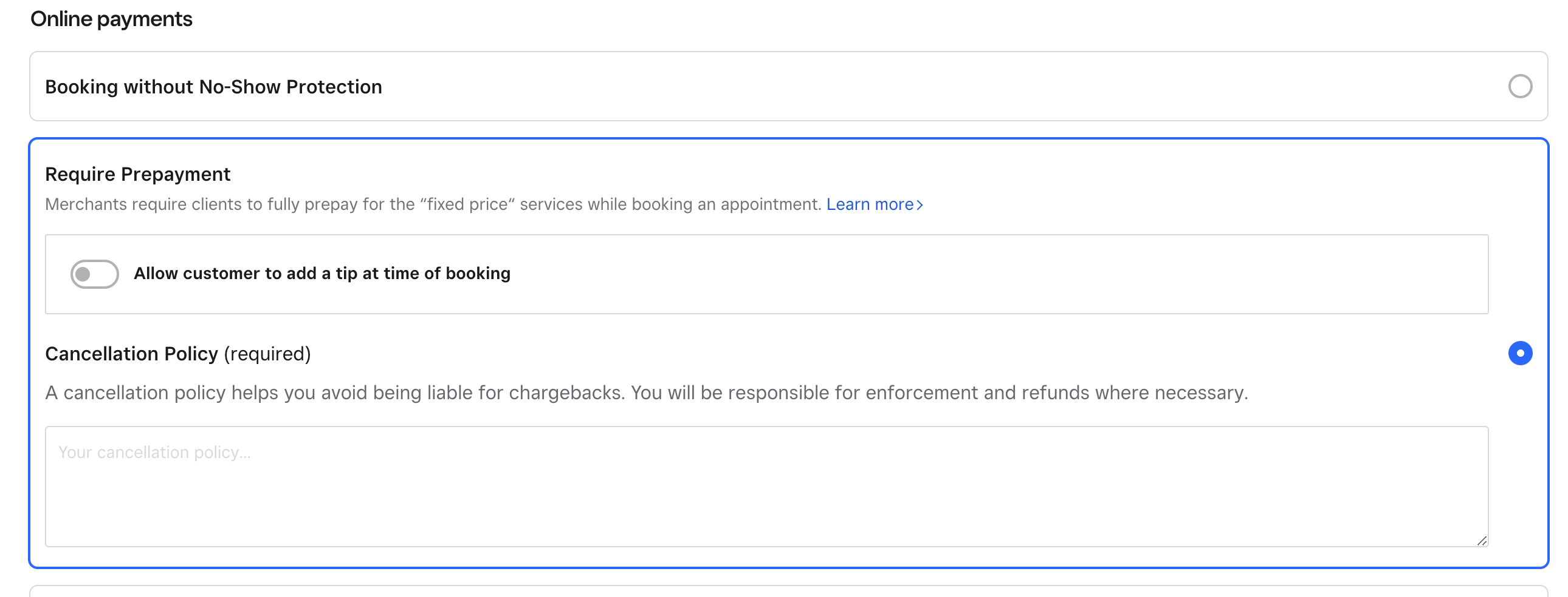 My Square does not say "Require Prepayment," it says "Require Full Prepayment" and the only option is to require the full prepayment of every service. I do not want that, and I'd like to only charge a small fee that goes towards the service booked.