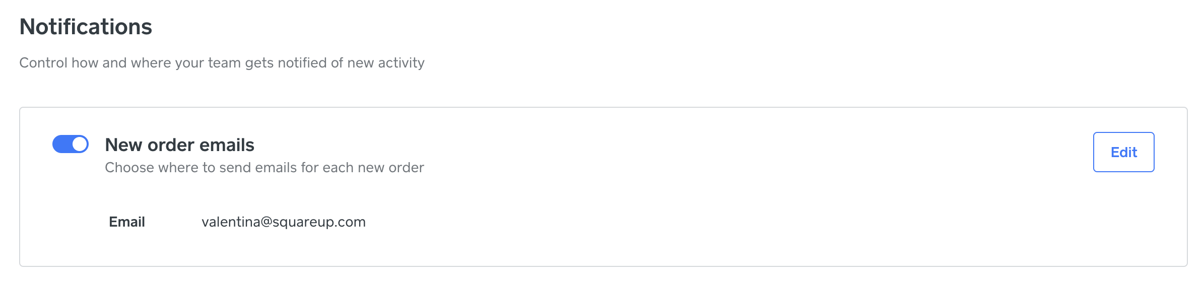 Head to your Square Online overview page > Settings / Shared Settings > Notifications