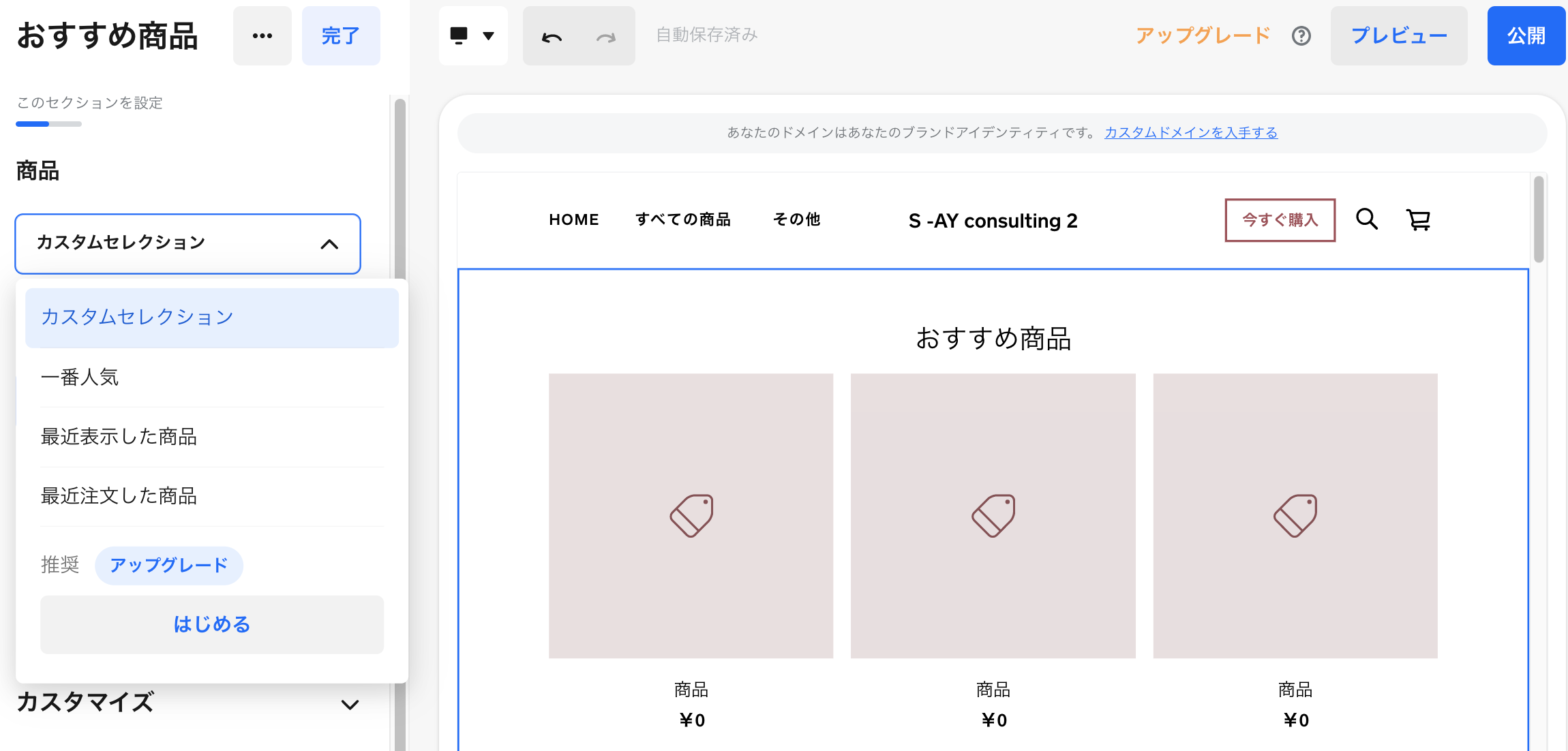 サイトの編集画面で編集したい商品ページを開き、+マーク > セクション > おすすめ商品を選択してテンプレートを選び、追加してください。「カスタムセレクション」では、手動でお薦めとして表示したい商品を商品カテゴリに関係なく追加できます。自動でおすすめを判別し表示する「推奨」を使用するには、プランのアップグレードが必要です。