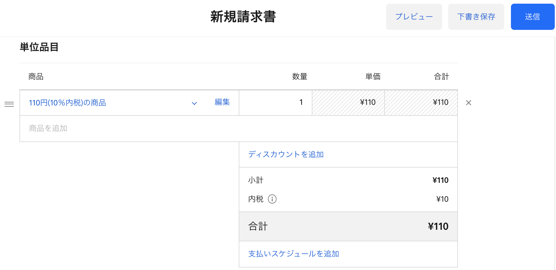 上記の設定で、手元にて請求書作成をしますと内税が下画像のように表示されます。