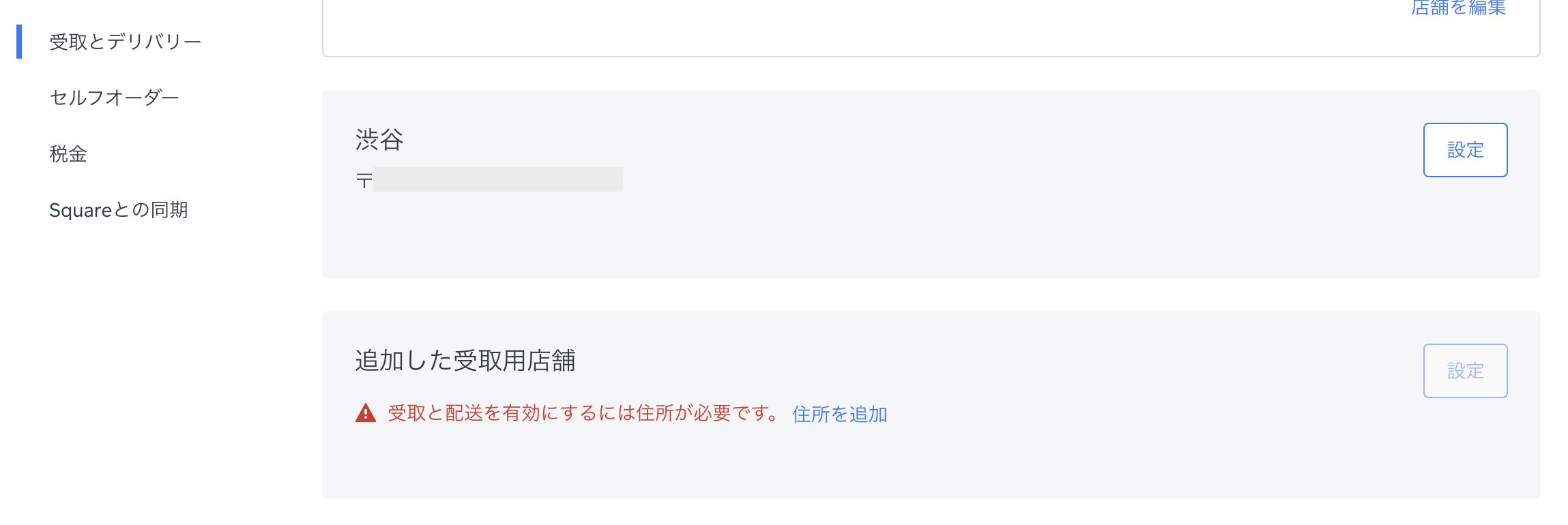 店舗を追加後、Square オンラインビジネスで受取店舗として追加した店舗を設定します。