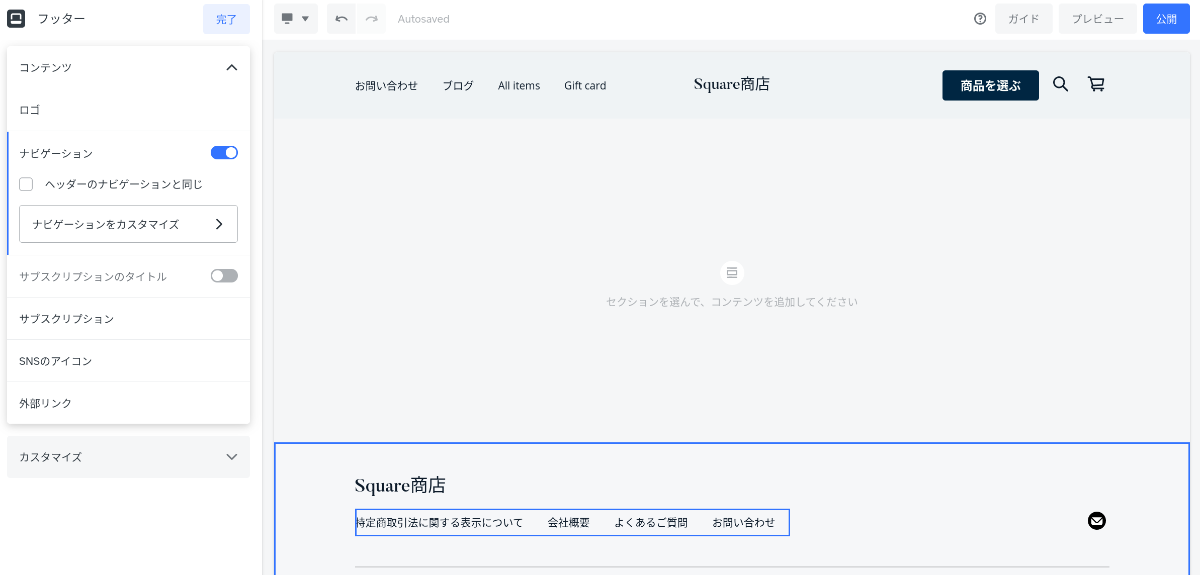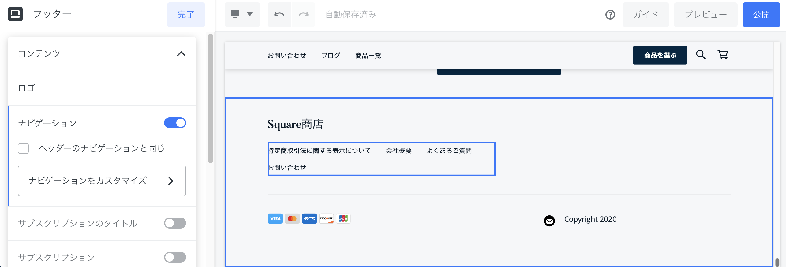 Square オンラインビジネスのウェブサイトフッターをカスタマイズする