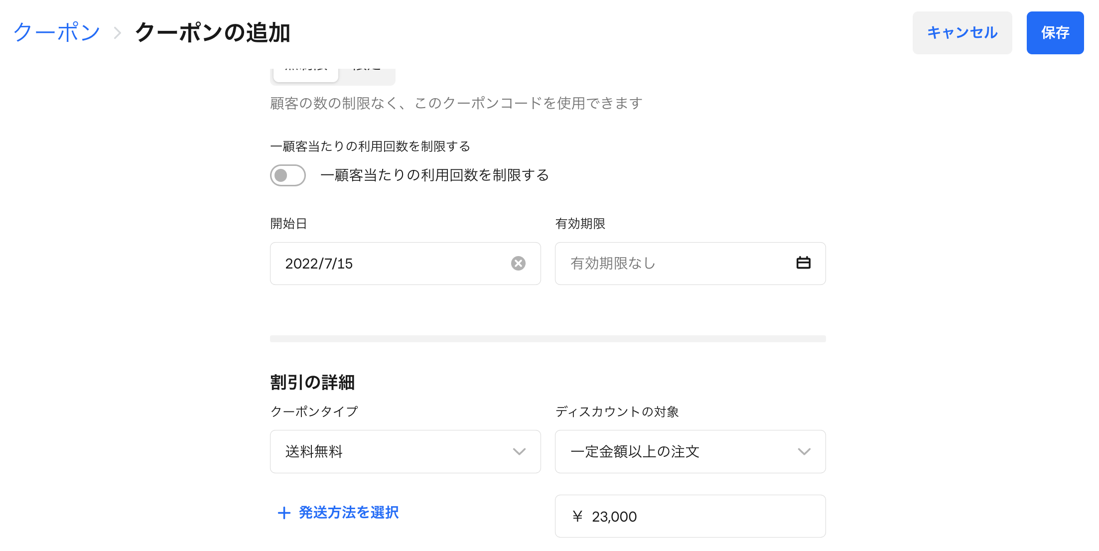 他に、送料無料とする方法として、クーポンを使用する方法もありますので、ご検討ください!クーポンを既に適用済みの状態のサイトのリンクやQRコードをお客さまにシェアすることも可能です。