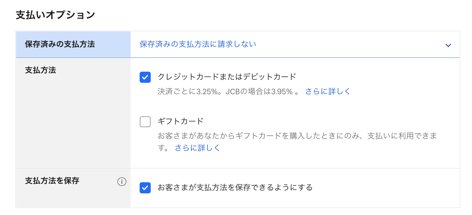 あるいは、支払いオプション欄にて、「保存済みの支払い方法に請求しない」を選択し、お客さまが請求書を受け取った際にお客さま側で請求に使用できるカード情報を入力して決済・保存していただくことも可能です。