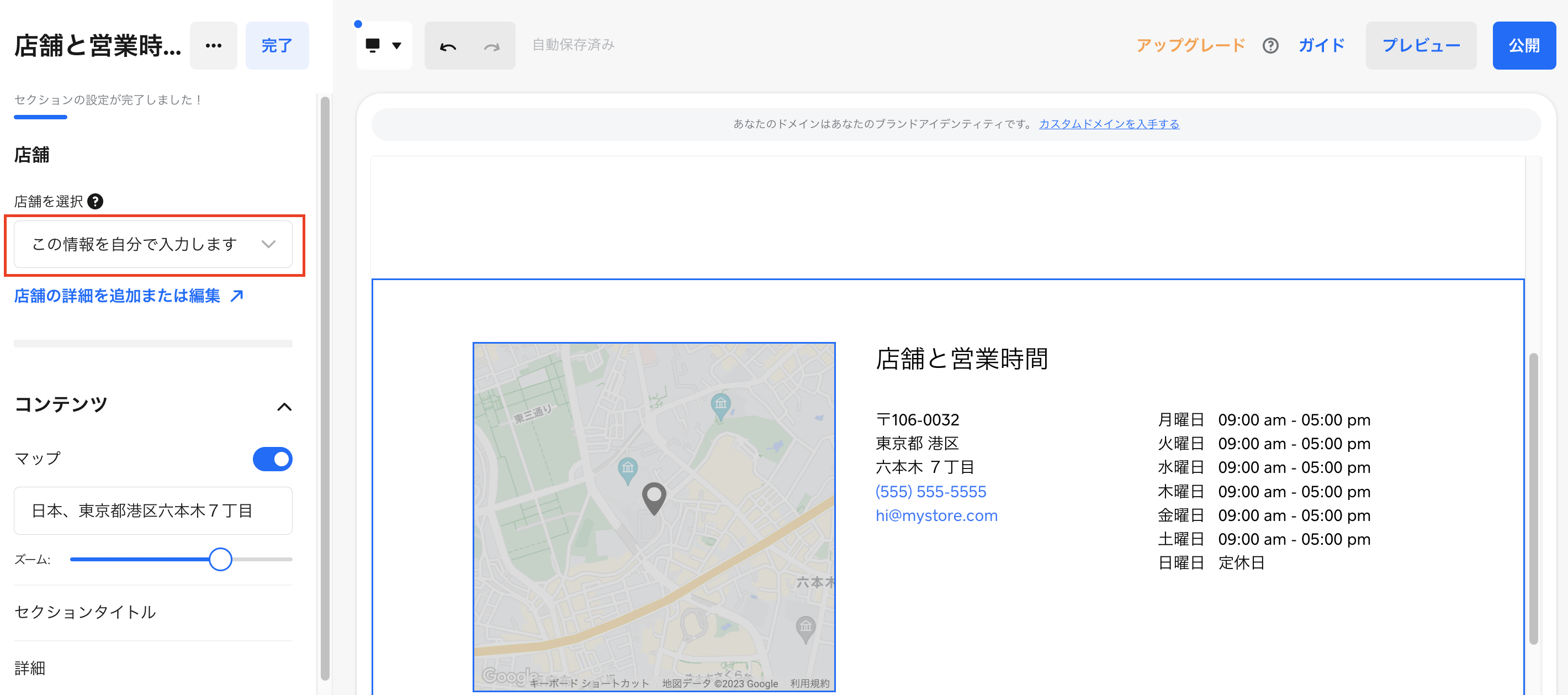 Square データ > 店舗情報 から店舗の営業時間を編集できます。あるいは、サイトの編集時に「店舗と営業時間」のセクション編集で、「この情報を自分で入力します」を選択すると、手入力することも可能です。