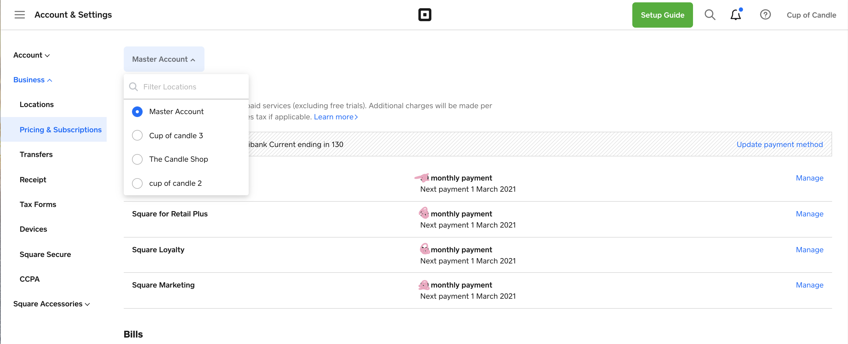 For each location accessing Square for Retail Plus’s advanced inventory system, there is a $79 subscription fee – charged on the first of the month. You will be able to specify which locations you want to activate the subscription for by selecting each location within Account & Settings > Pricing & Subscriptions: