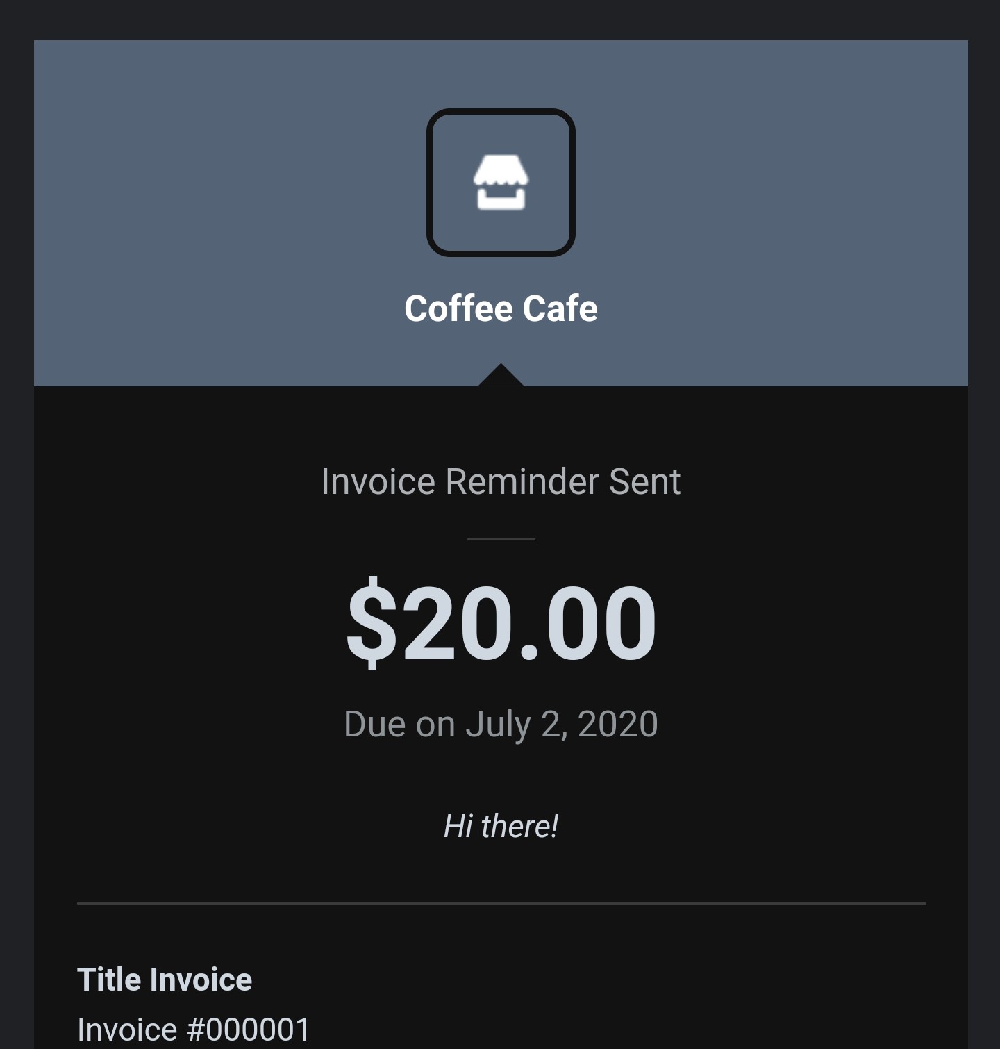 You'll notice that in the screenshot above - like in your screenshot - there is no Pay Invoice button. Below is what your client sees - the first image (New Invoice) is the original email, and the second image (Invoice Reminder) is of the reminder email. Your clients will see the button in the emails they receive: