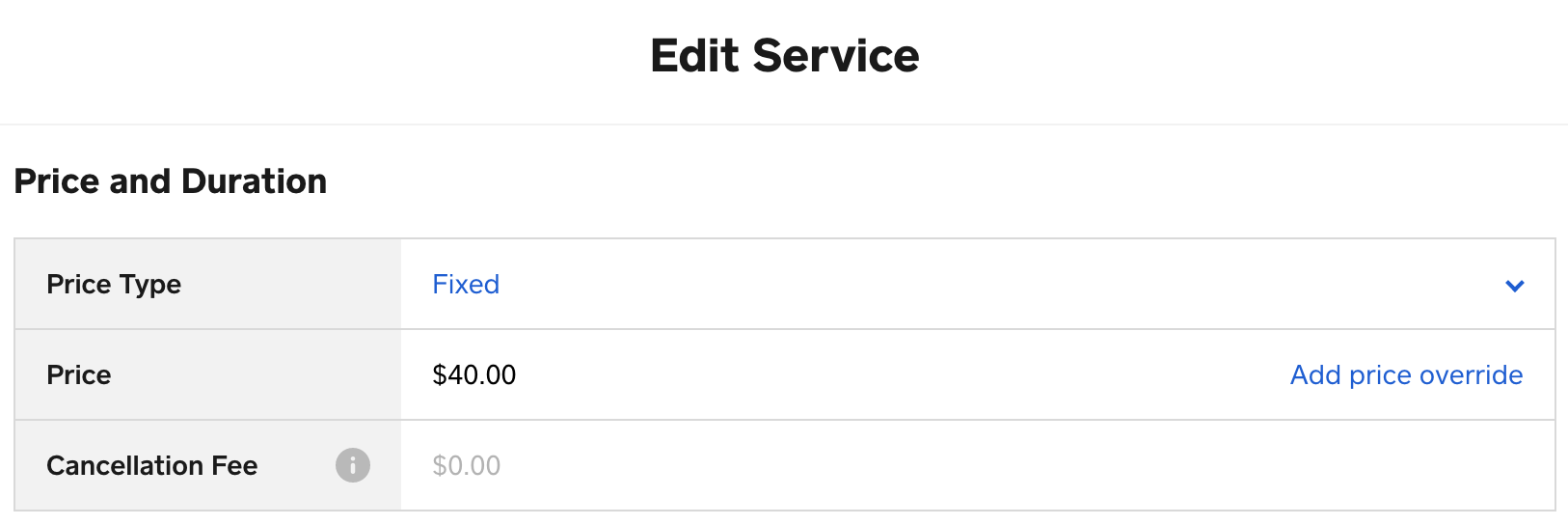You can check on this by heading to your Service Library > select a service to edit > scroll to Price and Duration section: